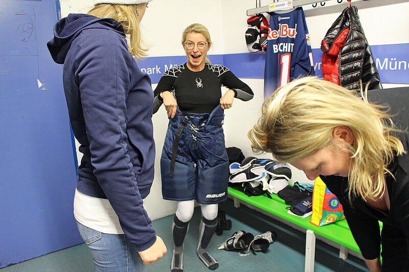 FTI-Vertriebsdirektor Richy Reindl mit Ulrike Härtel (Amadeus Leisure) und Roman Borch (E-Confirm)Frauen-Power (von links): Ulrike Härtel (Amadeus), Brigitte Enggruber (Flugbörse Pfarrkirchen), Bianca Bauer (Best-Reisen), Tanja Kaun (Sonnenklar TV Ingolstadt) sowie Lena Lechner, Inga Kludzeweit und Natalia Welsch von FTIProfis in Lauerstellung (von links): Nicolas Götz von Nix-wie-weg.de, Ömer Karaca von Schmetterling, Matthias Gürtler (touristik aktuell) und Aron Stiefvater vom Reisebüro StiefvaterGut geschützt: Allein das Ankleiden dauert 20 Minuten, hier Brigitte Enggruber von der Flugbörse PfarrkirchenAnfangs noch mit Pinguin, später freihändig: Maximilian Sanchez von ExpediaAntreten zum ersten BullyMit Action und Spaß auf dem Eisfeld der OlympiahalleSicher und warm: Auf der Wechselbank der Red Bulls MünchenPausenunterhaltung: Auf einer Sitzunterlage rutschen ausgewählte Teilnehmer in FTI-Kegel