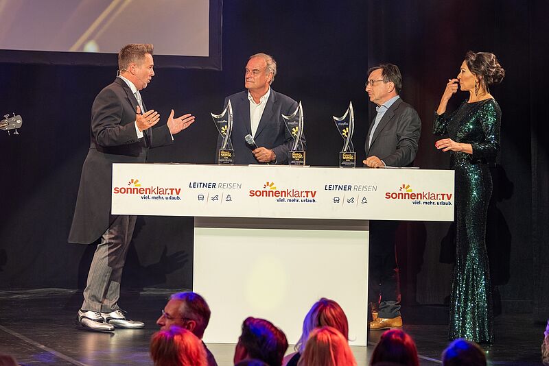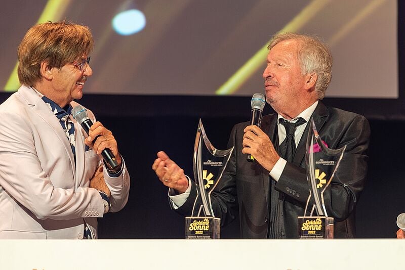 Preisträger der Sonnenklar-Gala: Harry Wijnvoord, Maren Gilzer, Jörg Draeger und Werner Schulze-Erdel. Foto: Schneider-Press/Wolfgang BreiteneicherSonnenklar-Moderator Kai Pätzmann mit den prämierten Größen des Sport-TVs: Jörg Wontorra, Ulli Potofski und Norbert Dobeleit. Foto: Max-Josef Kuchler/Sonnenklar TVLilo Wanders, Hans Mahr und Hans Meis nahmen je eine Auszeichnung mit nach Hause. Foto: Max-Josef Kuchler/Sonnenklar TVJörg Draeger mit Werner Schulze-Erdel. Foto: Max-Josef Kuchler/Sonnenklar TVEx-Senderchef Marc Conrad (Mitte) mit Hans Meiser. Foto: Max-Josef Kuchler/Sonnenklar TVSein Job ist, dem Publikum schon vor Show-Beginn einzuheizen: „Warmupper“ Christian Oberfuchshuber. Foto: Max-Josef Kuchler/Sonnenklar TVLilo Wanders mit Hans Meiser. Foto: Max-Josef Kuchler/Sonnenklar TVNDW-Ikonen Markus & Ivonne. Foto: Schneider-Press/Wolfgang BreiteneicherThomas Koschwitz, Marijke Amado und Uwe Hübner. Foto: Max-Josef Kuchler/Sonnenklar TVSchlager-Papst Ralph Siegel mit seiner Frau Laura Käfer. Foto: Max-Josef Kuchler/Sonnenklar TVComedy-Preise gab es für Hella von Sinnen, Lisa Fitz, Tanja Schumann und Tom Gerhard. Foto: Max-Josef Kuchler/Sonnenklar TVJörg Draeger, Werner Schulze-Erdel und Harry Wijnvoord mit den Sonnenklar Moderatoren Mary Amiri und Kai Pätzman. Foto: Max-Josef Kuchler/Sonnenklar TVHella von Sinnen im Interview auf dem Roten Teppich. Foto: Max-Josef Kuchler/Sonnenklar TVPop-Star Limahl sorgte für Top-Unterhaltung. Foto: Max-Josef Kuchler/Sonnenklar TVAuszeichnungen für die früheren Programmmacher Georg Kofler und Marc Conrad. Foto: Max-Josef Kuchler/Sonnenklar TV