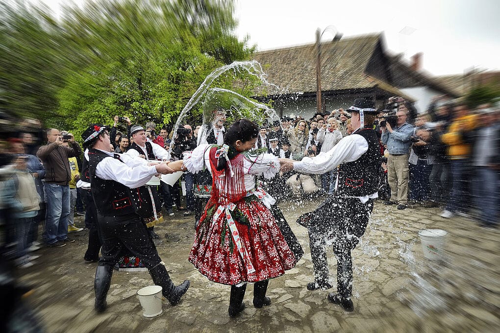 Männer schütten Wasser auf eine Frau als Teil des traditionellen Osterfests in Hollókő