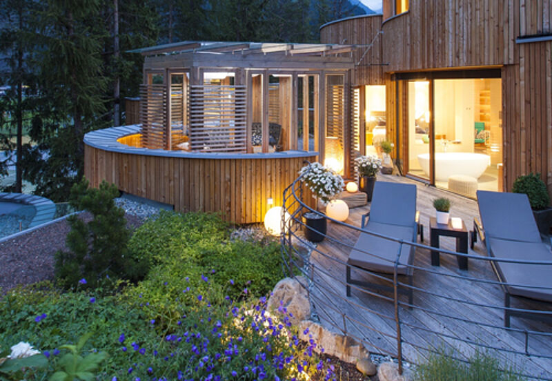 Das Naturhotel Waldklause im österreichischen Längenfeld hat eine 60 Quadratmeter große Baumgarten-Suite erhalten. Da das Hotel an einem Hang liegt, kann man von der Suite im ersten Stock sowohl mitten in die Bäume schauen, als auch auf der anderen Seite in einen Garten mit einer 80 Quadratmeter großen Terrasse gehen. I-Tüpfelchen im Zimmer ist die freistehende Badewanne vor einer gläsernen Front, die den Blick auf die Ötztaler Alpen freigibt. Wände und Möbel der Baumgarten-Suite wurden aus Apfelbaumholz gefertigt.
