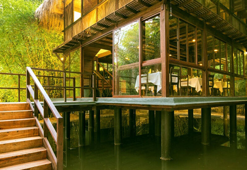 Gäste können zwischen drei Wasservillen, dem sogenannten Bamboo Grove mit einem Schlafzimmer mit gläsernem Kuppeldach und dem Tree House wählen, hier bilden die Äste einer Baumkrone das dreieckige Dach der Unterkunft. Das Restaurant befindet sich in einem Stelzenbau inmitten des Wassergartens und serviert wie alle Barberyn-Resorts nur vegetarische Gerichte. Auch der Künstler hat sein Studio auf dem Hotelgelände. Weitere Infos unter www.diyabubula.com.