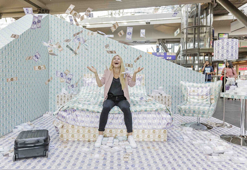 Die Intercontinental Hotels Group hat mit einer ungewöhnlichen Aktion in Berlin für Direktbucher geworben. Mitten auf dem Hauptbahnhof wurde ein so genannter „Money Room“ für Passanten eingerichtet. Der Raum und die Möbel wurden mit Geldscheinen tapeziert, Scheine flatterten sogar durch die Luft. Interconti lud Bahnhofsbesucher zum „Bad in 20 Millionen Euro“ ein.