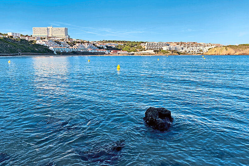 Das dominierende Gebäude des Ferienortes allerdings ist das Palladium Menorca hoch oben auf dem Hügel. Der Bau stammt aus den 80er Jahren und war lange ein Fiesta-Hotel mit Drei-Sterne-Niveau. Im Lockdown wurde es von der Fiesta-Mutter Palladium zum Vier-Sterne-Haus aufgewertet und wird seitdem unter diesem Label vermarktet.