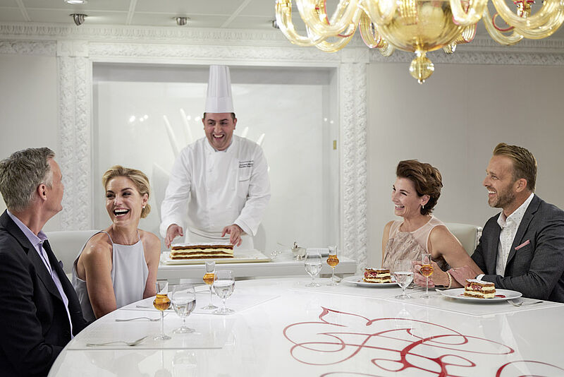 Ein exklusives Abendessen auf See erleben Passagiere der Marina und Riviera im Privée. In edlem privaten Rahmen kann sich hier eine Gesellschaft von bis zu zehn Gästen auf eine lukullische Reise begeben. Das selektierte Menü-Angebot beinhaltet ein neues Degustationsmenü sowie ein Menü mit Weinbegleitung und zudem die Best of Kompositionen aus den Restaurants Polo oder Toscana. Die mehrgängigen Menüs umfassen Klassiker sowie ausgefallene Kreationen und versprechen einen genussreichen Abend.