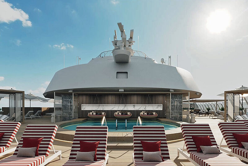 Ausgebaut wurden zwei beliebte Bereiche: „The Retreat“, zugänglich nur für Suiten-Gäste, wurde um 40 Prozent Fläche und auf zwei Außendecks erweitert. Und die offene „Sunset Bar“ am Heck ist um 180 Prozent größer und erstreckt sich nun über mehrere Ebenen terrassenförmig ebenfalls über zwei Decks.