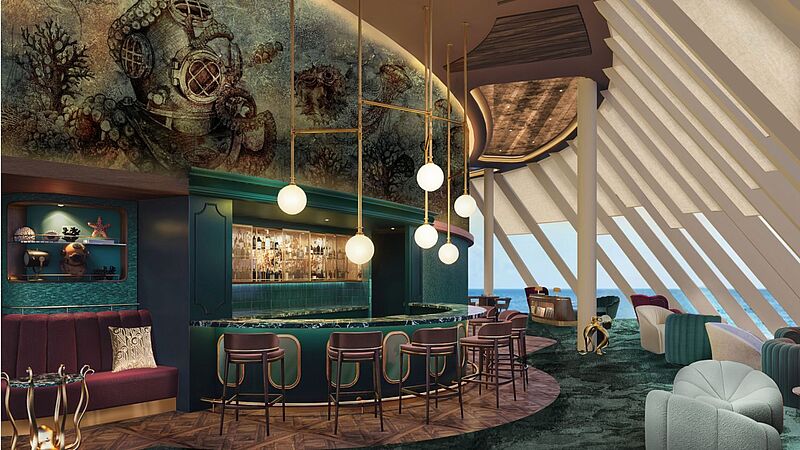 So empfange das Atrium auf den Decks drei bis fünf die Passagiere „mit luftigem Design und von Leichtigkeit geprägter Architektur“. In jedes Deck dieses Bereiches falle durch besonders große Fensterfronten viel Tageslicht. Das Design, die Farbgebung der Teppiche und die Möblierung spiegelten das Meer wider, so TUI Cruises.