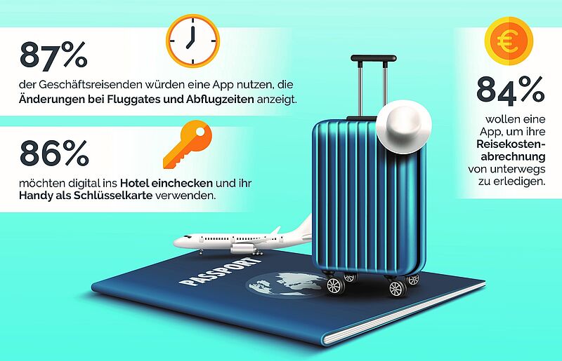Digitale Lösungen, die das Reisen vereinfachen, werden seit Pandemiebeginn immer beliebter bei Geschäftsreisenden. Auf Platz eins der Wunschliste steht ein Verspätungswarner, der Änderungen bei Gates und Abflugzeiten übermittelt. Eine solche App würden 87 Prozent aller Geschäftsreisenden nutzen, vor Corona waren es 81 Prozent.