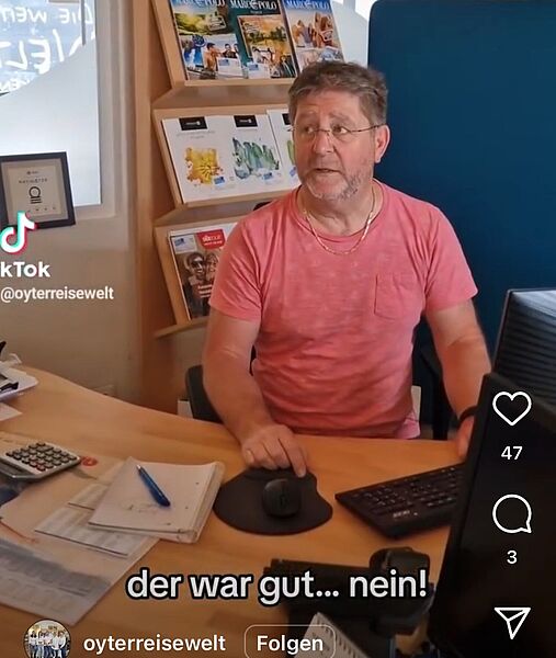 Das Video kann sowohl auf dem Instagram-Kanal der Oyter Reisewelt abgerufen werden, als auch bei Tiktok. Da es aus der Masse der Reels heraussticht und als Vorlage und Idee für weitere Reisebüros dienen kann, hat die ta-Redaktion es zum Reel des Monats gewählt. In den kommenden Monaten werden in dieser Rubrik weitere besondere Beiträge von Reiseverkäufern vorgestellt. Wer in dieser vorgestellt werden möchte, schreibt eine E-Mail an u.fiedler(at)touristik-aktuell.de.