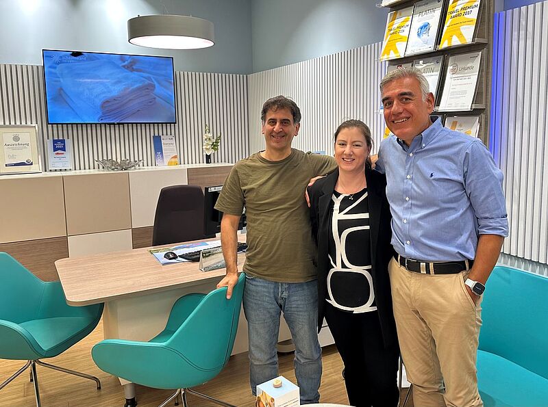 Das nach wie vor einzige Innenstadt-Reisebüro der Kette ist heute eines von acht Büros, die nach Corona den Erfolg von My Travel Company fortführen sollen. Und Kenan Seyrekbasan, auf dem Foto zu sehen mit Reiseverkäufer Ergin Baltaci (links) und Prokuristin Sarina Färber, ist äußerst optimistisch: „Wir können auf ein super Stammpersonal vertrauen. Und wir sind mit unseren starken regionalen Teams auch 2025 sehr erfolgreich unterwegs.“