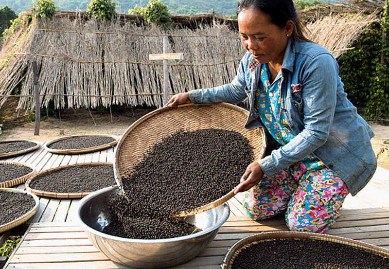 Pfeffer aus Kampot ist nämlich nicht einfach nur scharf, sondern besticht durch unzählige Aromen. „Die grünen Körner sind mild mit einer Zitrusnote. Der rote Pfeffer schmeckt süß und fruchtig. Der weiße hat eine herbe und der schwarze Pfeffer eine würzige Schärfe“, erzählt Sorn Sothy, die mit ihrem deutschen Mann Norbert Klein eine Pfefferplantage führt, die ihre Tore für Besucher öffnet.