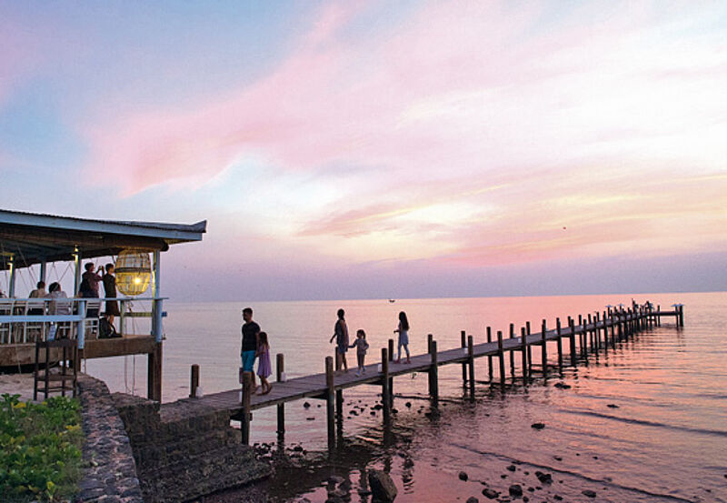 Geschichtsbücher besingen die Idylle, man sollte also vorbereitet sein. Doch steht man dann tatsächlich an Kambodschas Küste, um mit einem Drink in der Hand unter säuselnden Palmen den Sonnenuntergang zu bestaunen, stockt der Atem trotzdem. Vor 100 Jahren entwickelte sich die Region zu Asiens Cote d’Azur: Die Inselchen im Golf von Siam und der Ort Kep-sur-Mer mit Casino und 1.000 Villen wurden zum Treffpunkt der High Society. Die Roten Khmer beendeten das mondäne Treiben, doch inzwischen ist die Region wieder en vogue.Schicke Boutique-Hotels