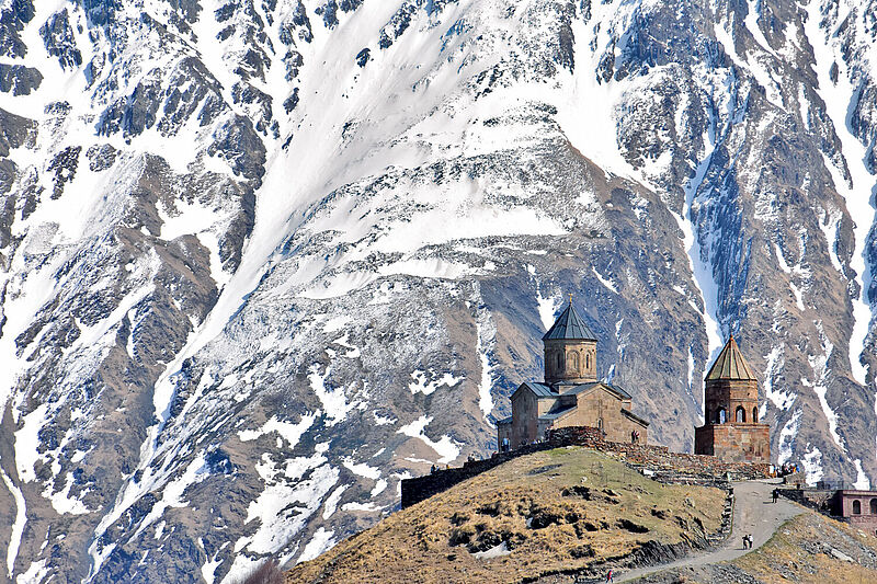 Nach knapp zwei Stunden Fußmarsch erscheint das Ziel auf einer letzten hohen Kuppe. 400 Meter über Stepanzminda thront hier seit 600 Jahren die stolze Dreifaltigkeitskirche wie ein Leuchtturm des Glaubens vor einer schroffen Felswand. Früher wurde der georgische Kronschatz in dieser Bergeinsamkeit verwahrt, erzählt Latsabidse. Aktuell rüsten sich die Mönche mit einer Restaurierung für den Ansturm künftiger Gäste.