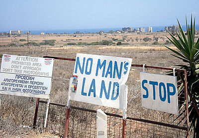 Weit entfernt im Osten der Insel herrscht Grabesstille im „No Man’s Land“. Am Horizont ist die Hotel-Skyline von Famagusta im Dunst zu erkennen, sogar einen alten Baukran sieht man dazwischen. Er könnte als Symbol für die nahe Zukunft der Region herhalten: Im Falle einer Wiedervereinigung Zyperns soll hier und in der angrenzenden Salamis-Region ein neuer Ferienkomplex im Rahmen eines türkisch-griechisch-zypriotischen Joint Ventures entstehen.