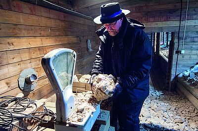 Brocken mit Amethysteinschlüssen werden in der Amethystmine gewogen. Als Besucher kann man hier selbst Steine klopfen