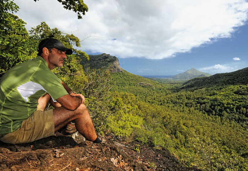 Dicke Tropfen hängen silbrig glänzend an den Blättern, der Boden dampft. Nebelschwaden steigen auf, verschleiern das Tageslicht, das nur spärlich durch die dichten Baumkronen dringt. Bei mehr als 30 Grad Celsius erinnert die schweißtreibende feuchte Hitze an Sauna - der Eukalyptuswald duftet wie ein Aufguss. Jeden Mittag regnet es im Inneren von Mauritius kurz und heftig, die Hitze hüllt den Wald danach in dichten Nebel.Ein enger Pfad führt hindurch auf die Spitze eines Bergs, etwa zwei Stunden dauert der Anstieg. "Man gewöhnt sich daran", tröstet Yan de Maroussem lachend. Der 44-jährige Wanderführer stapft mit sicheren Schritten den glitschigen Trampelpfad immer weiter hoch. "Oben wird die Luft wieder besser", verspricht er. Die Baumstämme rechts und links sind hell und glatt, am Laub bedeckten Boden wachsen nur wenige Farne.