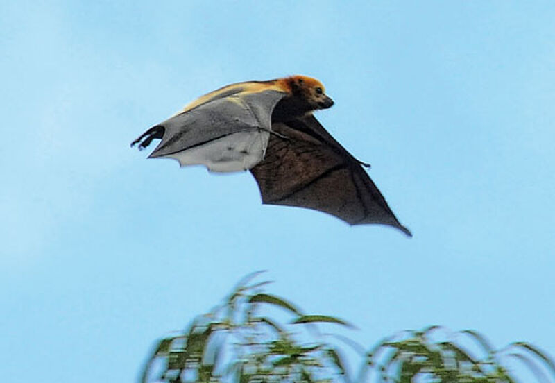 Plötzlich piepst es in den Baumkronen, dann ist deutlich ein Flattern in den Blättern zu hören. "Flughunde", erklärt Yan und schaut nach oben. "Die sind hier überall. Das ist ihr Tal, das wir gleich sehen werden."Auf dem rutschigen Untergrund ist der Aufstieg anstrengend. Die Hosenbeine sind mittlerweile nass und braun, das Profil der Wanderschuhe ist kaum noch zu erkennen. Yan geht unbeeindruckt weiter, der Pfad wird schmaler und ist schließlich nur noch ein Eingang zu einer Höhle aus Ästen, Zweigen und Blättern. Geduckt geht es die letzten Meter behutsam Schritt für Schritt voran.