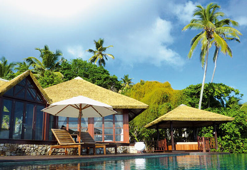 Nur gut drei Quadratkilometer misst Fregate Island, das den Zusatz „Private“ zu Recht trägt. Die Insel ist ein Hotel, aber keines im herkömmlichen Sinn. Das Haupthaus mit Bar, Bibliothek und Boutique sowie einem Restaurant schmiegt sich an einen dicht bewachsenen Hang. Die Gäste wohnen nicht hier, sondern in verstreuten Anwesen in gediegenem Kolonialstil. Natürlich träumt man im Himmelbett, relaxt im Salon mit den gediegenen dunklen Holzmöbeln. Jedes Haus hat einen eigenen großzügigen Pool. Dazu eine weitläufige Terrasse mit schattigem Pavillon und Whirlpool. 16 solcher Villen und eine „Presidential Villa“ verstecken sich in der tropischen Vegetation. Maximal fünfzig Gäste können zur selben Zeit hier unterkommen. Auf jeden Urlauber kommen drei dienstbare Geister, die dafür sorgen, dass kein Wunsch unerfüllt bleibt.