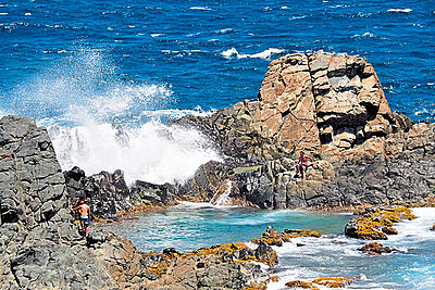 Wild und schrundig zeigt sich die Nordküste, wo Geländefahrzeuge einem Topziel entgegenrumpeln: dem Naturpool Conchi mit glasklarem Wasser. Für Frischwasserzufuhr sorgen Wellen, die über die Felsen schäumen.