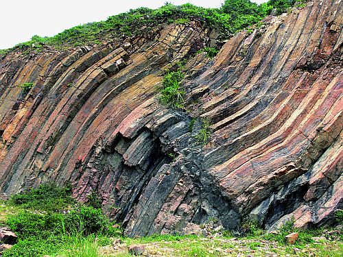 Mit einer großzügigen Handbewegung fährt der Ranger die Gesteinsrichtungen nach: Von wo schoben welche Erdkräfte? Wie konnten sich die Strukturen bilden? Hinter jeder Schicht, jeder Linie steckt eine spannende Geschichte. Was aussieht wie eine moderne Design-Struktur, entpuppt sich als erkaltete Asche. Je nach Farbe und Textur erläutert Leung, wie schnell und unter welchen Bedingungen die Lava erkaltete. Erst zu Beginn der 70er Jahre entdeckte Hongkong die weltweit nahezu einmaligen Basaltsäulen beim Bau des High-Island-Süßwasserreservoirs.