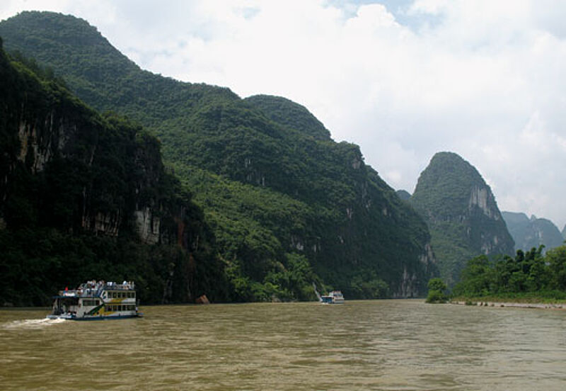 Sanft geschwungene Berge mit üppiger Vegetation begleiten die kontemplative Tour. Mal stechen einzelne graue Felsen wie überdimensionale Nadeln in den Himmel, mal reiht sich Kuppe an Kuppe. Kleine Wasserfälle stürzen sprudelnd von den Felsen hinab ins schlammige Wasser. Die Gegend strahlt im frischen Grün dichter Wälder und tropischer Pflanzen, der Süden Chinas ist warm und feucht. Ein Dunstschleier wabert über dem Li Jiang, auch inmitten der Natur ist der Himmel selten klar.