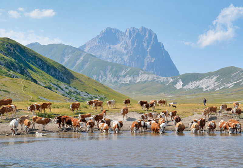 Bis zum Corno Grande können sogar die Urlauber blicken, die morgens noch an der 50 Kilometer entfernten Adria oder auch in der Hauptstadt Rom, von der man rund zwei Stunden mit dem Auto braucht, aufgewacht sind. Von dort aus geht es in eine andere Welt: in den Nationalpark Gran Sasso, in die Hochebene am Campo Imperatore, in eine menschenleere und karge Vegetation, die von den Besuchern wegen ihrer Ödnis auch „Klein-Tibet Europas“ genannt wird. Noch trifft man hier Kuh- und Schafhirten und deren Hunde, die die Tiere vor den Wölfen und Braunbären bewachen.