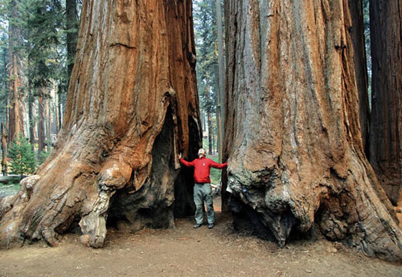 Im Sequoia-Nationalpark in Kalifornien stehen einige der größten Bäume der Welt. Nicht die höchsten, nicht die ältesten, aber die dicksten. Gemessen am Volumen kann es kein Lebewesen auf der Welt mit ihnen aufnehmen. Elf Blauwale müssten sich auf eine Waage schmeißen, um dem größten Mammutbaum mit seinen rund 1.400 Tonnen Konkurrenz zu machen. Selbst die Freiheitsstatue würde neben ihm erblassen, weil sie ihre Fackel noch einige Meter höher recken müsste, um die Krone zu erreichen.