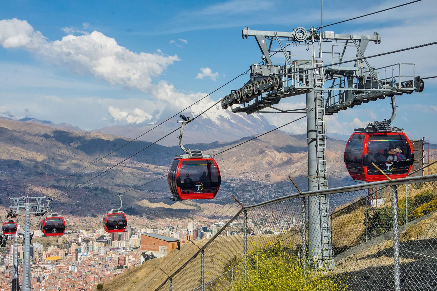 Auf neun Linien schweben die Gondeln der Seilbahn „Mi Teleferico“ fast geräuschlos über das Häusermeer des höchstgelegenen Regierungssitzes weltweit. Bis zu 26.000 Menschen befördert das System über alle Linien pro Stunde in Höhen zwischen 3.200 und 4.100 Metern. W-Lan an Bord ist inklusive, ein Sitzplatz und Aussicht sind garantiert. Und wer Gepäck oder ein Rad dabei hat, der bezahlt einfach doppelt.